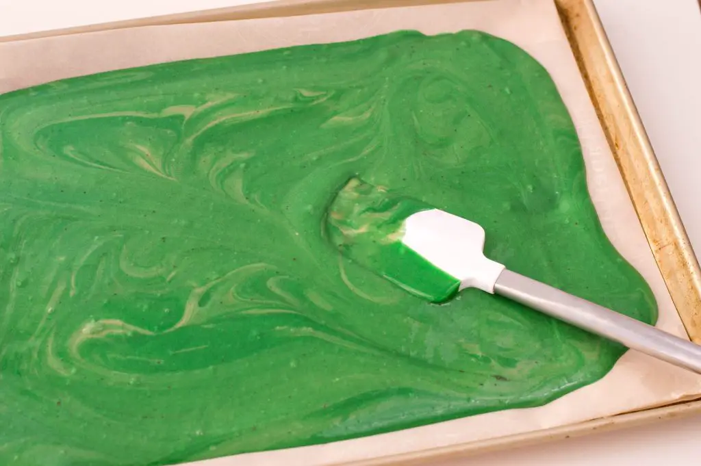 - Using a spatula, spread your cake batter onto your lined baking sheet. Bake according to the box’s directions.