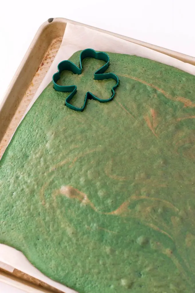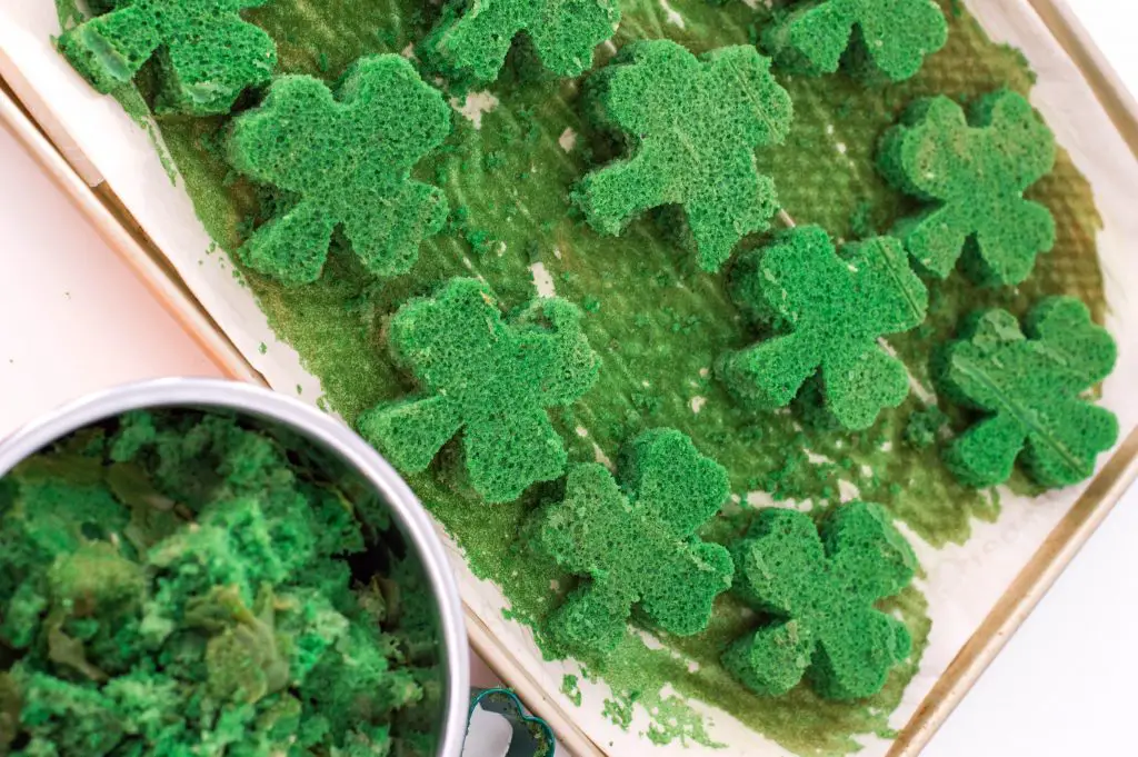 Once the cake is finished baking, remove it from oven and allow to cool. Then, using your cookie cutter, cut out 4-leaf clover shapes and save the scraps for snacking!
